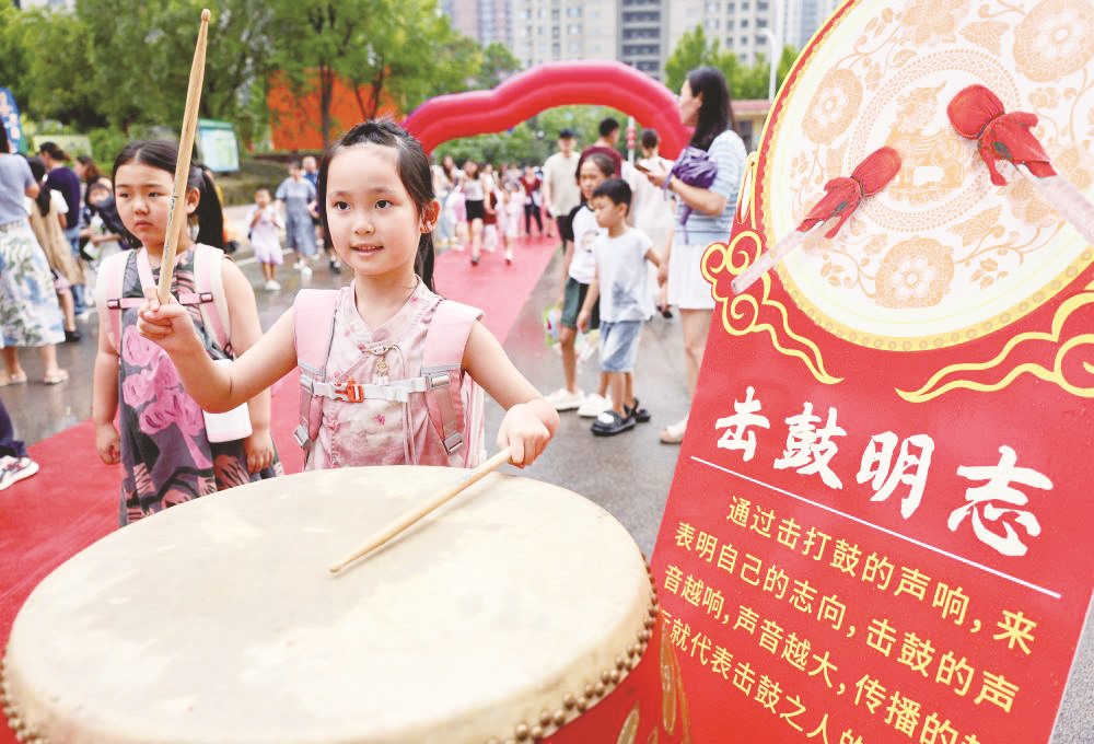 在山东省枣庄市市中区东湖小学,一名一年级新生在“击鼓明志”。(孙中喆 /摄)