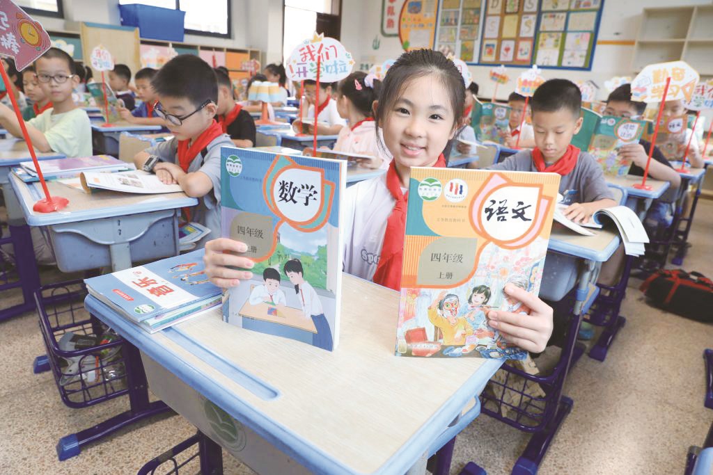 在浙江省舟山市南海实验学校惠民桥小学校区,一名四年级的学生展示刚领到的新课本。(陈永建/摄)