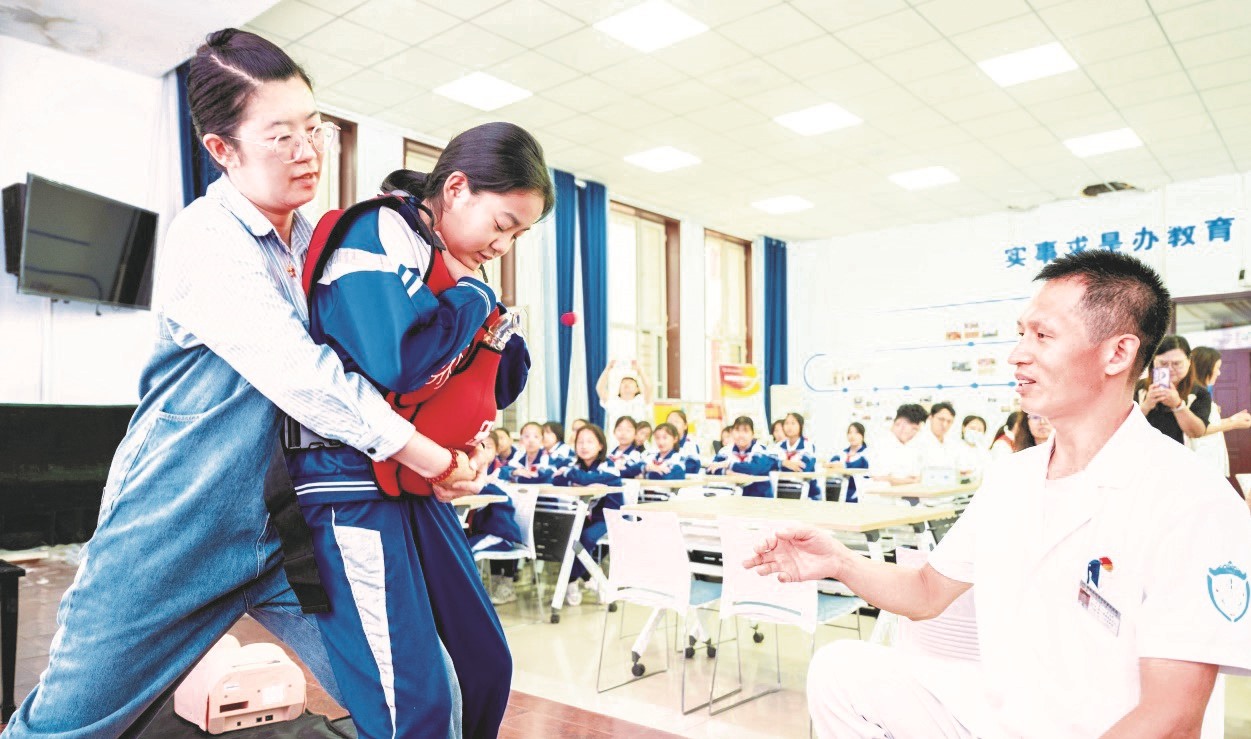 医护人员在呼和浩特市玉泉区小召小学指导师生练习海姆立克急救法。