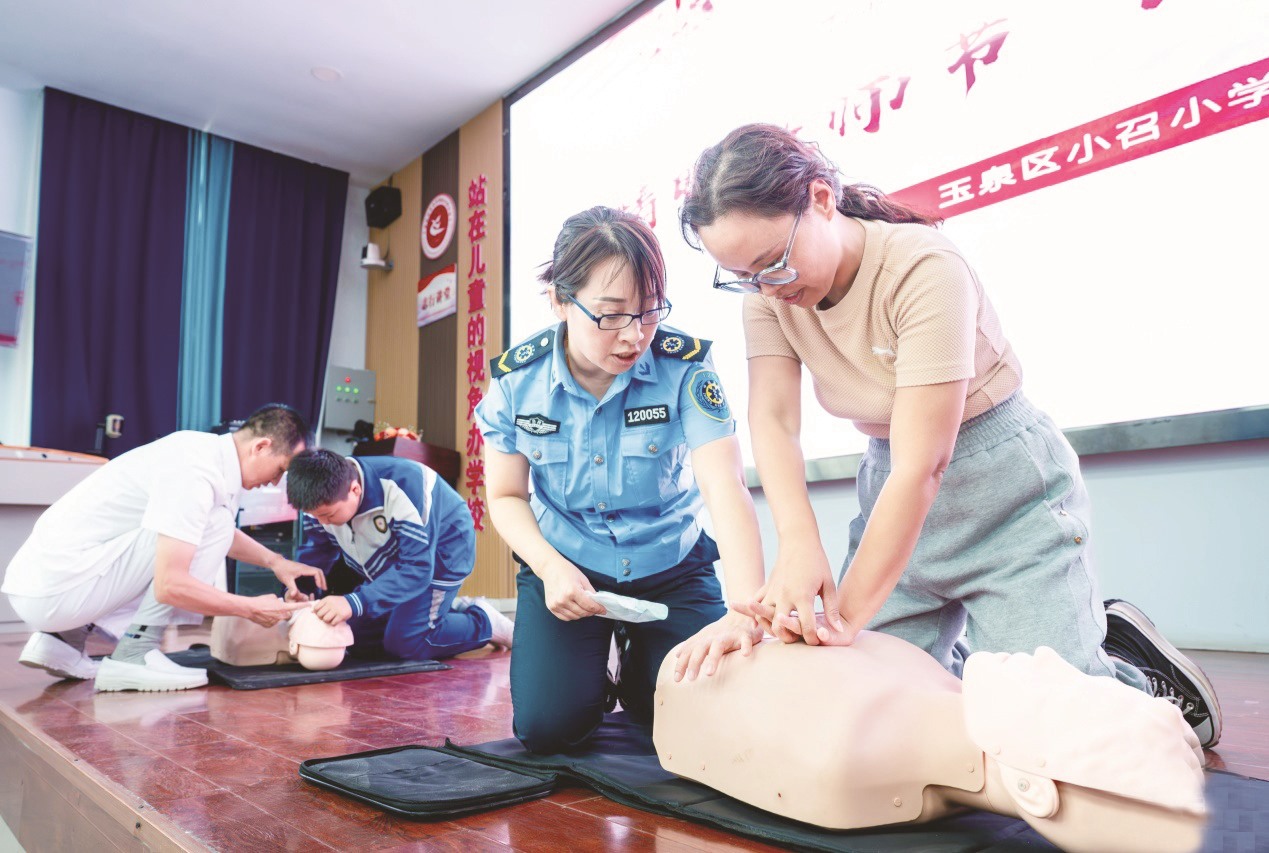 医护人员在呼和浩特市玉泉区小召小学指导师生练习心肺复苏技能。