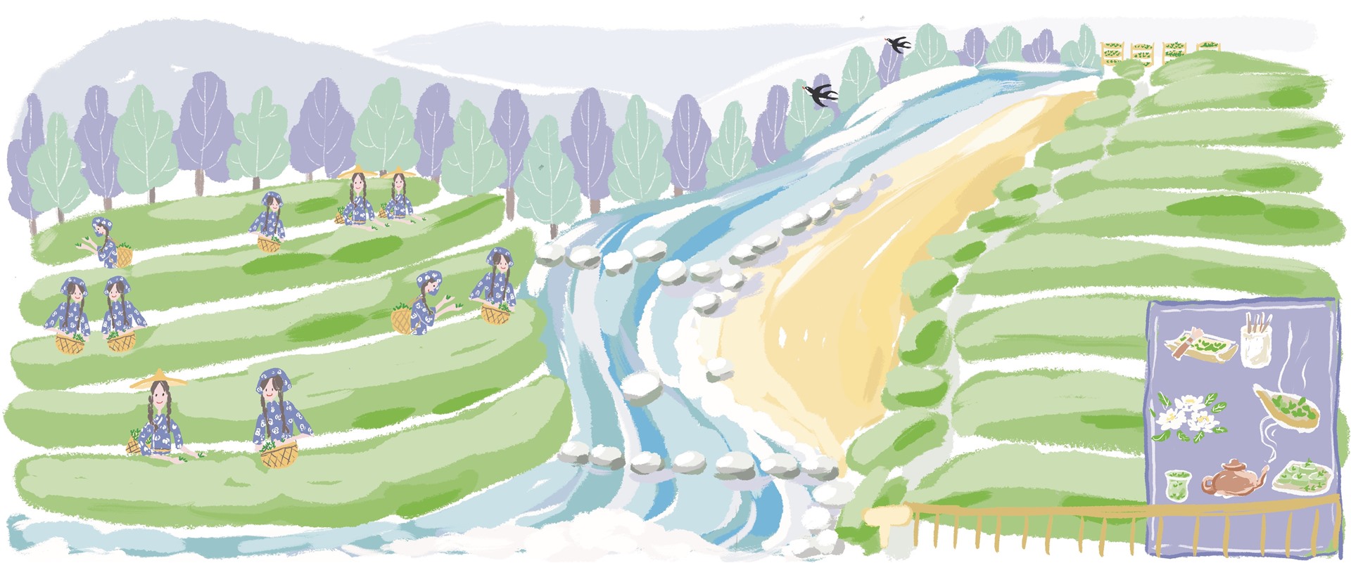 既见龙井茶,何不趁机去访龙井村呢?我沿着九溪十八涧溯流而上,时而踏石而过,时而涉水徐行。转过几道山弯,就到了龙井村。龙井村北邻北高峰、狮峰山,南接九溪十八涧,东望西湖美景,群山环抱,生态优越。西北的天竺峰如屏风阻隔寒天北风,南面九溪直通钱塘江,将湿润的东南风引入山谷,雨水丰沛,特别适合茶树的生长。这里的村舍依着山势层叠错落,空气里似乎也沉淀着经年茶香,沁人心脾。