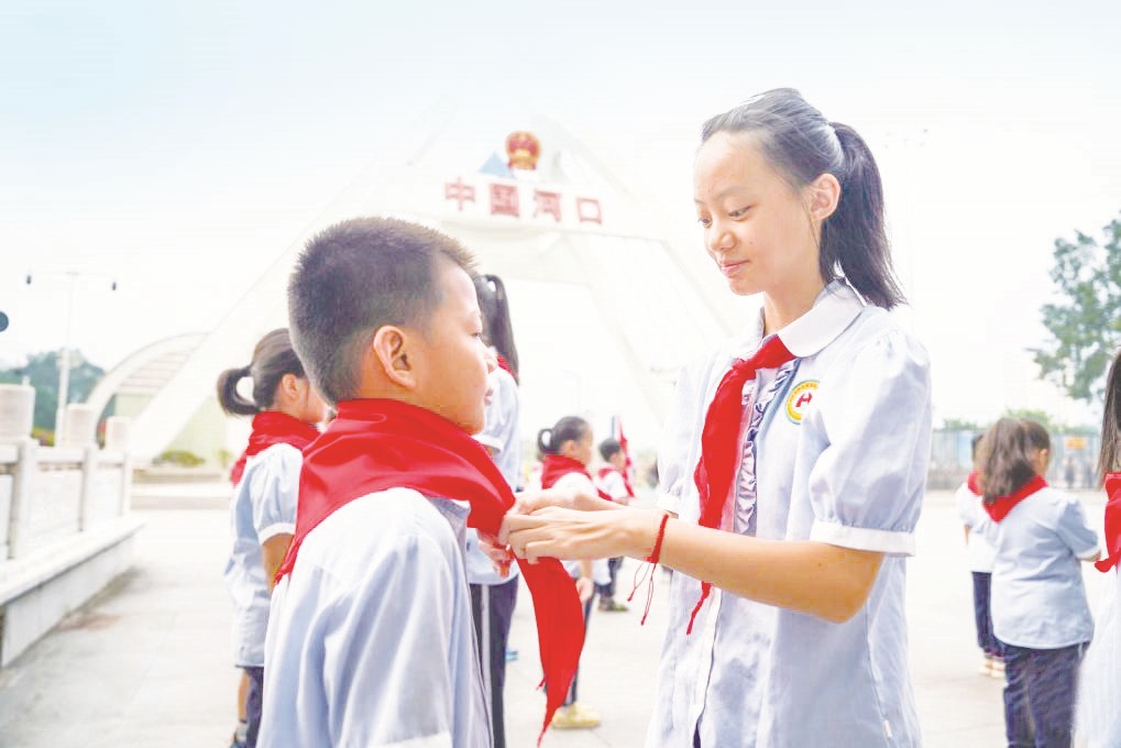 10月13日,在云南省红河州河口县,河口国门小学少先队老队员为新队员佩戴红领巾。(赵国骁/摄)