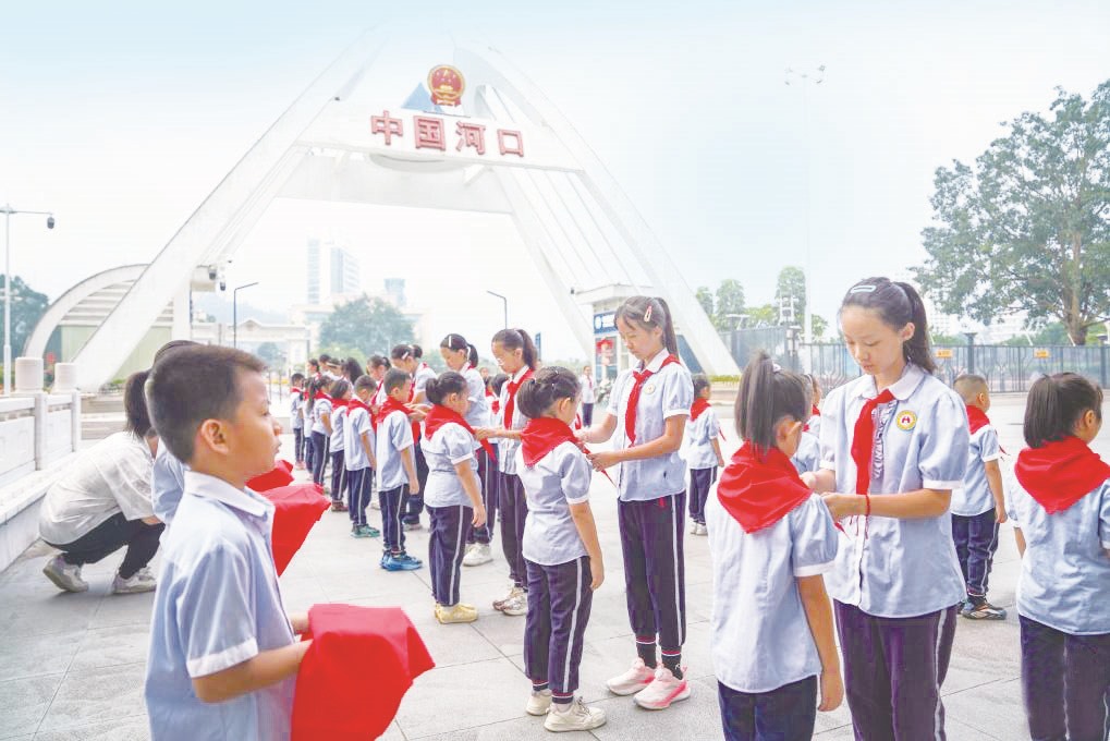 10月13日,在云南省红河州河口县,河口国门小学少先队老队员集体为新队员佩戴红领巾。(赵国骁/摄)