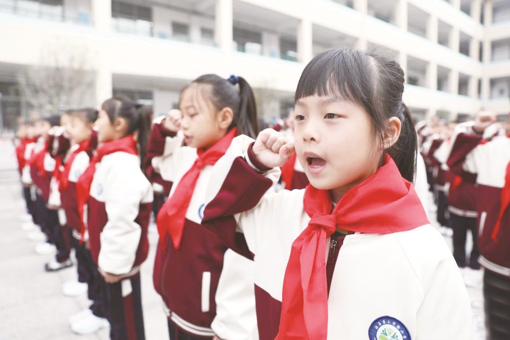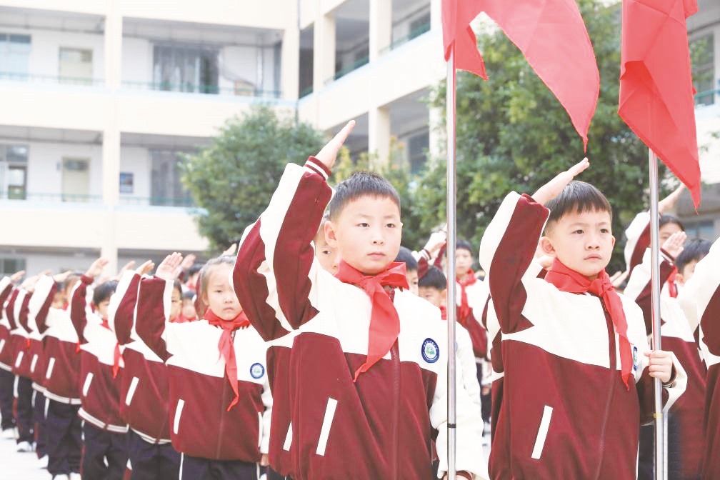10月13日,河南省焦作市温县第三实验小学一年级学生进行入队宣誓。(徐宏星/摄)