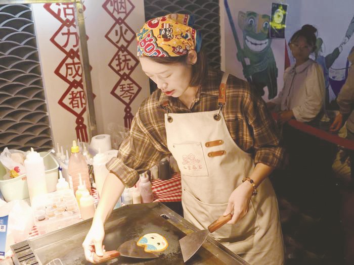 ▲卡通煎饼摊“主理人”曾雅鑫在制作煎饼。(吕杨/摄)
