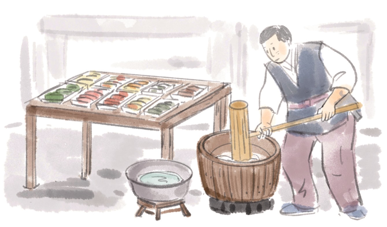我买了打糕,边吃边站在一旁看店铺里的匠人们捶糯米团,他们抡着木槌打糯米团的声音“哐当哐当”此起彼伏。为了尊重食材本身的味道,制作者们不以外力干预增加保存期,所以打糕没有添加剂和防腐剂,现做现吃,保质期在常温下只有一到两天。