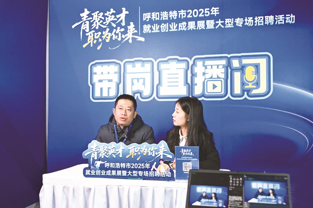 企业工作人员(左)在招聘活动现场开展直播,介绍岗位情况。