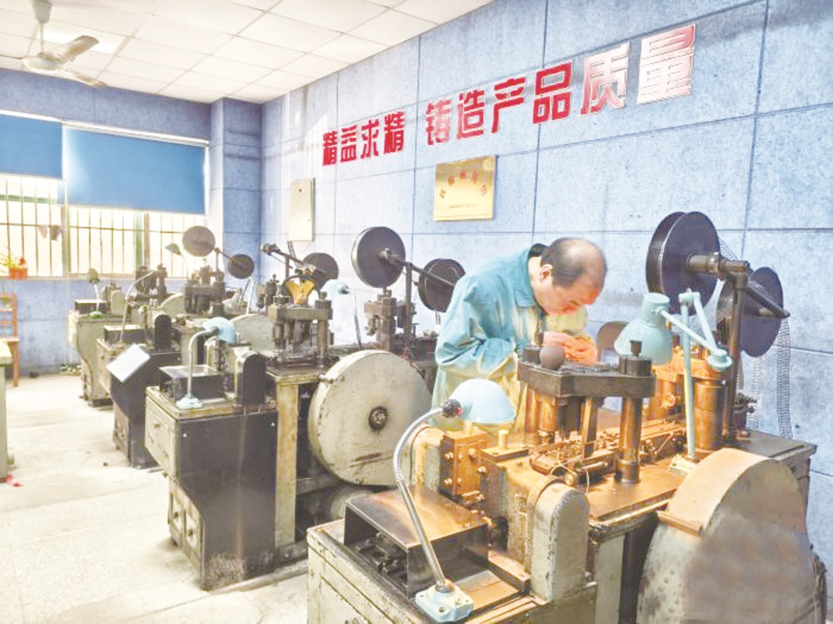 ▲刘根敏在英雄金笔厂笔尖车间工作。(上海市普陀区/供图)