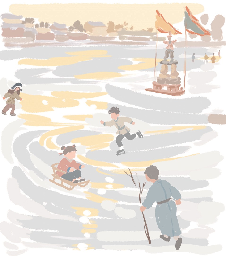 什刹海四季皆美,《帝京景物略》就曾以“西湖春,秦淮夏,洞庭秋”来赞美什刹海的神韵。可要我说,最令人亲近的,当属冬天的什刹海。它没有春日垂柳拂波的温婉、夏日荷香逼人的热烈,亦不见秋日湖光沉碧的静谧。在寒冬的锤炼中,流动的碧水慢慢凝成一整块巨大的白玉,为人们带来时节限定的快乐。每到什刹海结冰的时候,原本只是路过的我,被晶莹的冰面和嬉戏的人群吸引,忍不住驻足流连。他们或飞驰,或旋转,或借助各种滑行工具,无一不闲适惬意,又那样热气腾腾。这便是流传了数百年的冰嬉习俗。