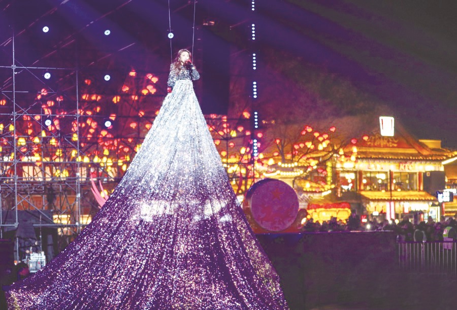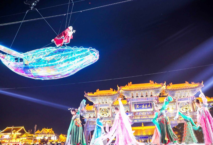 演员在呼和浩特市玉泉区塞上老街旅游休闲街区跨年夜活动现场表演《又见昭君》高空秀。(丁根厚 /摄)