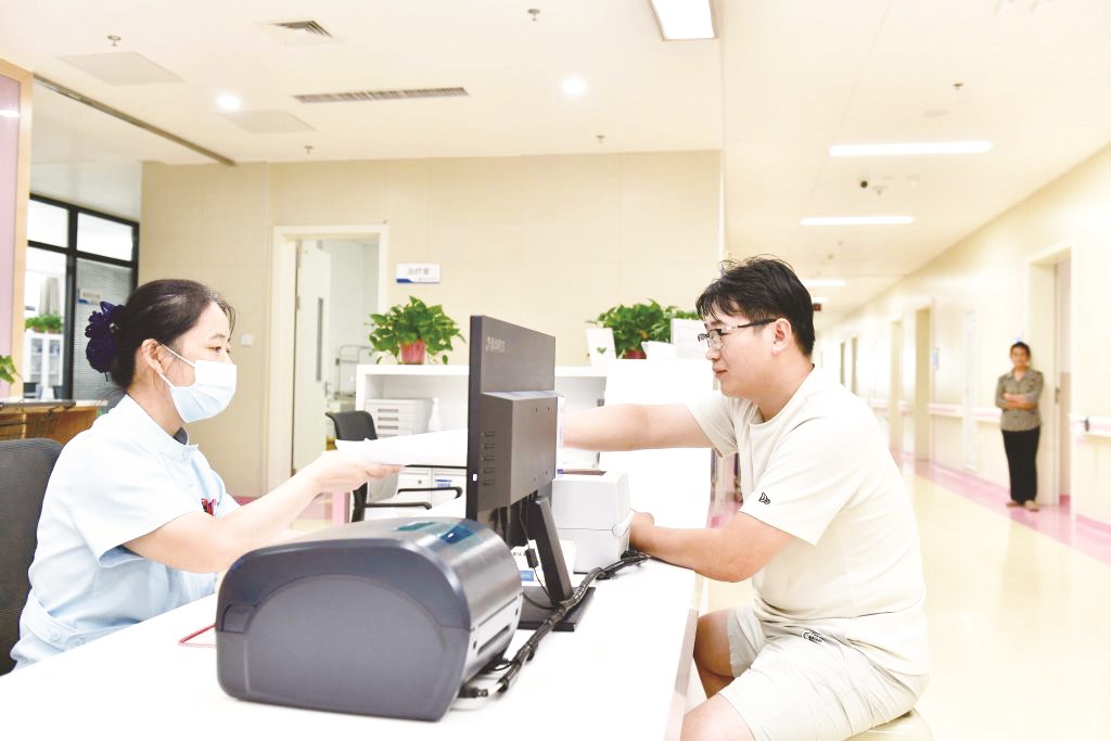 ▲2025年8月21日,在郓城县人民医院产科护士站,工作人员在为产妇家属做诊间医保结算。(郭绪雷/ 摄)
