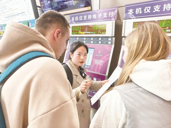 随着成都入境旅游市场持续升温,天府国际机场的地铁售票处、航站楼里,活跃着一群特殊的志愿者。他们手持地图、熟练操作地铁购票系统,一边为外国游客提供购票、指路、景点推荐等便民服务,一边把机场变成“实景英语角”,在实战中锻炼口语能力。
