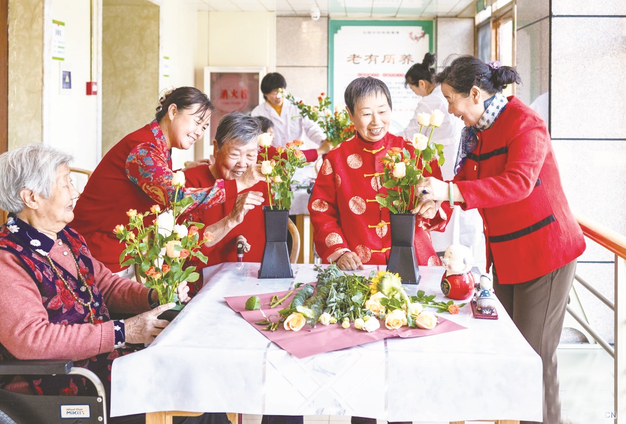 ▲10月27日,老人们在呼和浩特市玉泉区民政局“爱心敬老 情暖重阳”主题活动现场体验插花花艺。(丁根厚 /摄)
