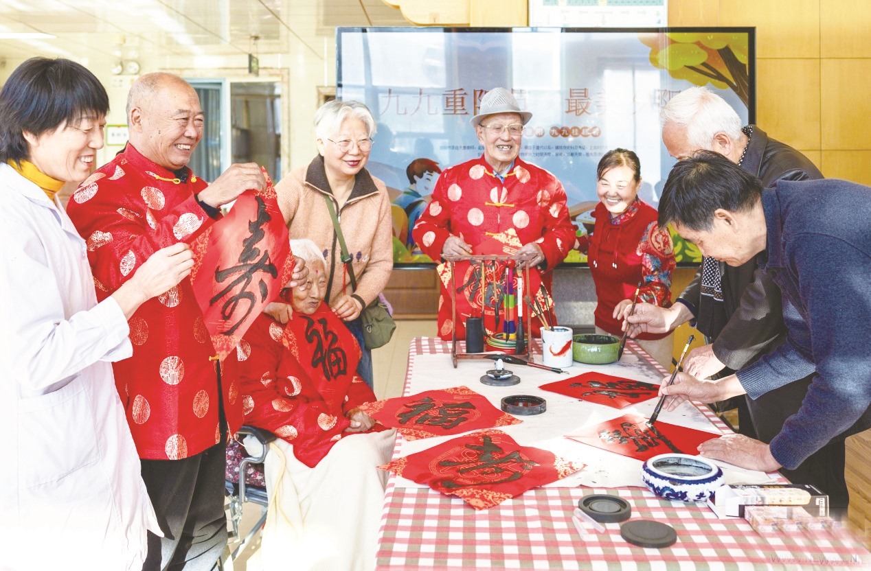 ▲10月27日,文化志愿者在呼和浩特市玉泉区民政局“爱心敬老 情暖重阳”主题活动现场为老人们书写 “寿”字书法作品。(丁根厚/ 摄)