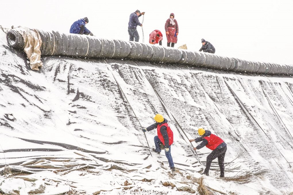 在河南省焦作市博爱县孝敬镇博爱源蔬菜专业合作社,辖区供电职工帮助菜农对蔬菜大棚保暖棉被进行维护。(程全/摄)