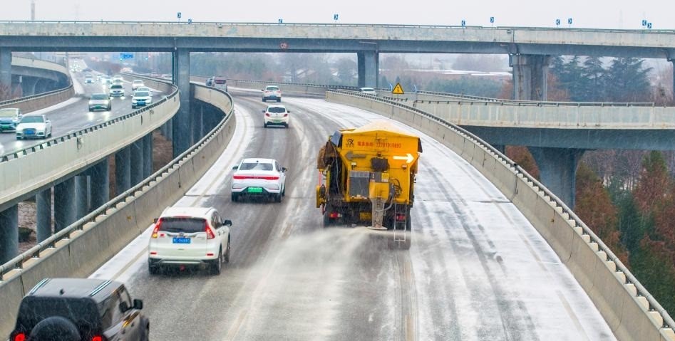 在河南省洛阳市古王立交,市政集团车辆对道路进行撒布融雪剂作业。(张怡熙/摄)