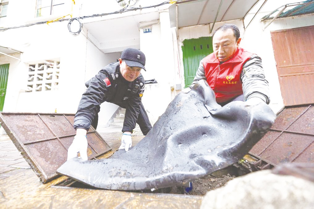 志愿者在浙江省湖州市吴兴区龙泉街道西白鱼潭社区一老旧小区包裹供排水管。(伊凡/摄)