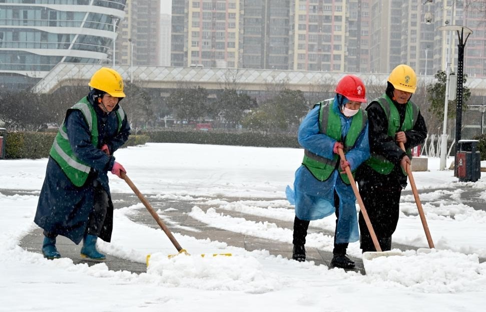在安徽省亳州高新区市政公园,园林工人在清理路面积雪。(刘勤利 /摄)
