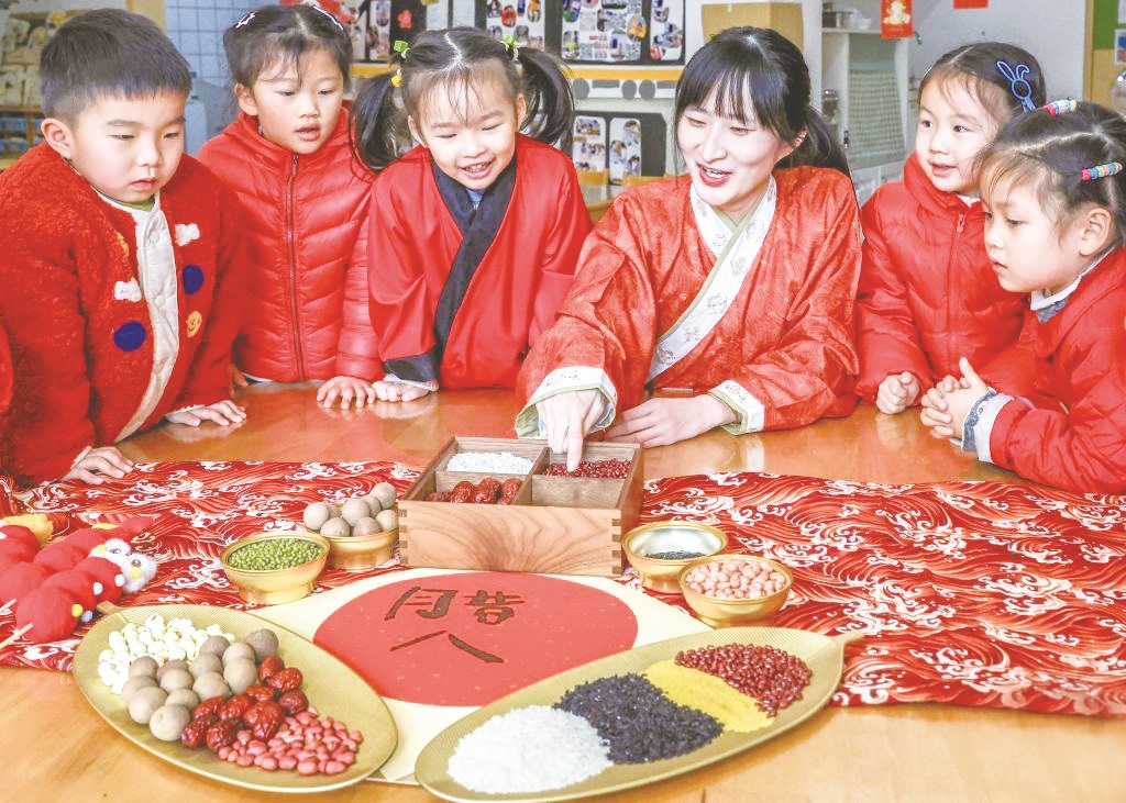 在江苏省南京市太平巷幼儿园,老师为小朋友们讲解制作腊八粥的食材。(辛一 /摄)