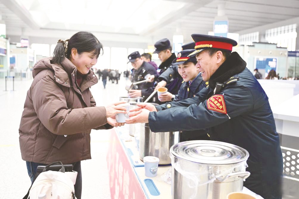 在合肥南站候车大厅,工作人员将腊八粥送给旅客。(周牧 /摄)