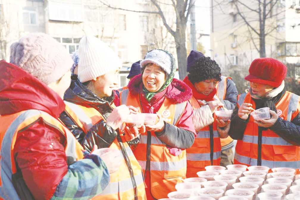 在河北省唐山市丰润区燕山路街道欣园社区,环卫工人品尝志愿者送来的腊八粥。(朱大勇/摄)