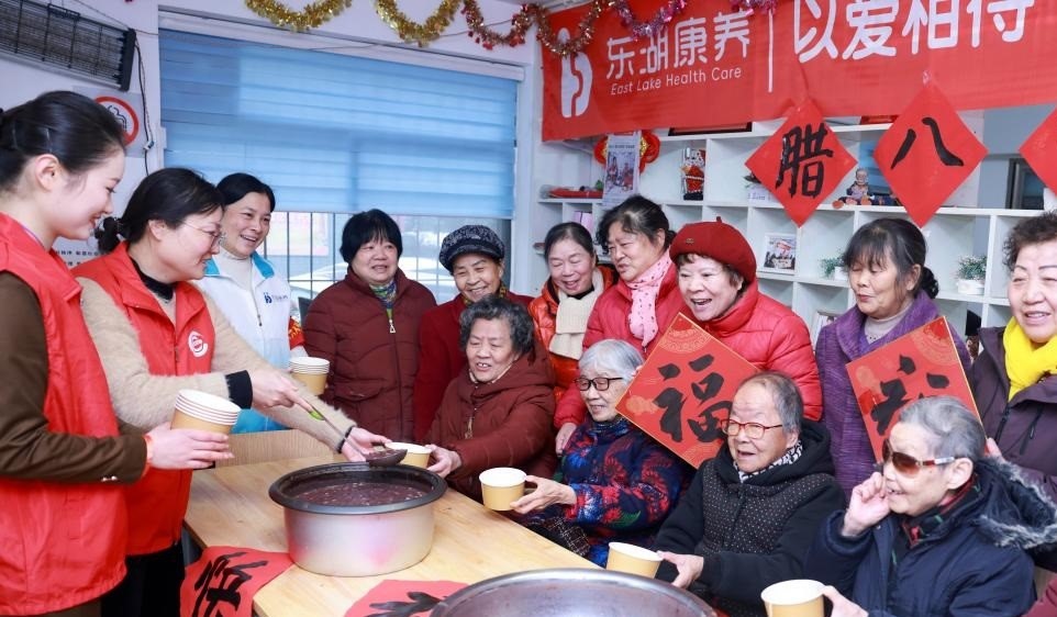 在湖北省武汉市黄鹤楼街道读书社区老年人活动中心,老年人品尝腊八粥。(赵军/摄)