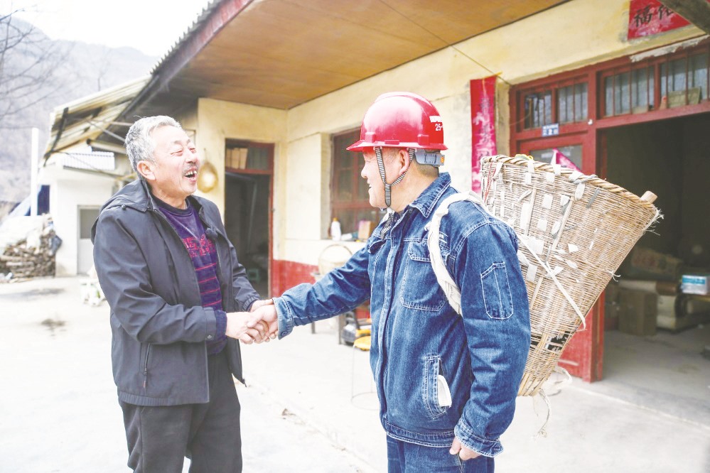 ▲在甘肃省陇南市两当县泰山乡同心村,村民曹永礼(左)和杨店供电所所长宋刚告别。(郎兵兵 /摄)
