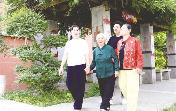 ▲杜雪娥一家陪婆婆散步。