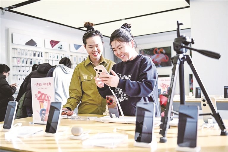 呼和浩特市民在七彩城购物中心选购手机。(王磊/摄)