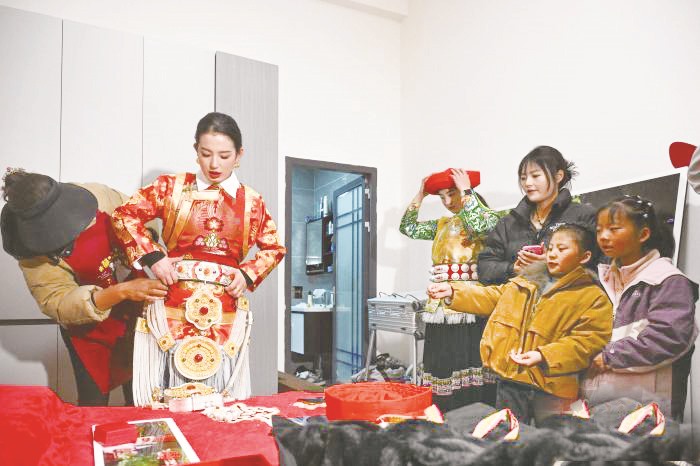 1月24日,婚礼迎来高潮。清晨,永宗早早开始梳妆打扮,在亲人的帮助下穿上传统藏装,佩戴嘎乌盒、腰带等配饰。配饰上的一颗颗红珊瑚,比金银装饰更加耀眼。“这些配饰是从我婆婆的婆婆传到我这一代的。”永宗介绍。