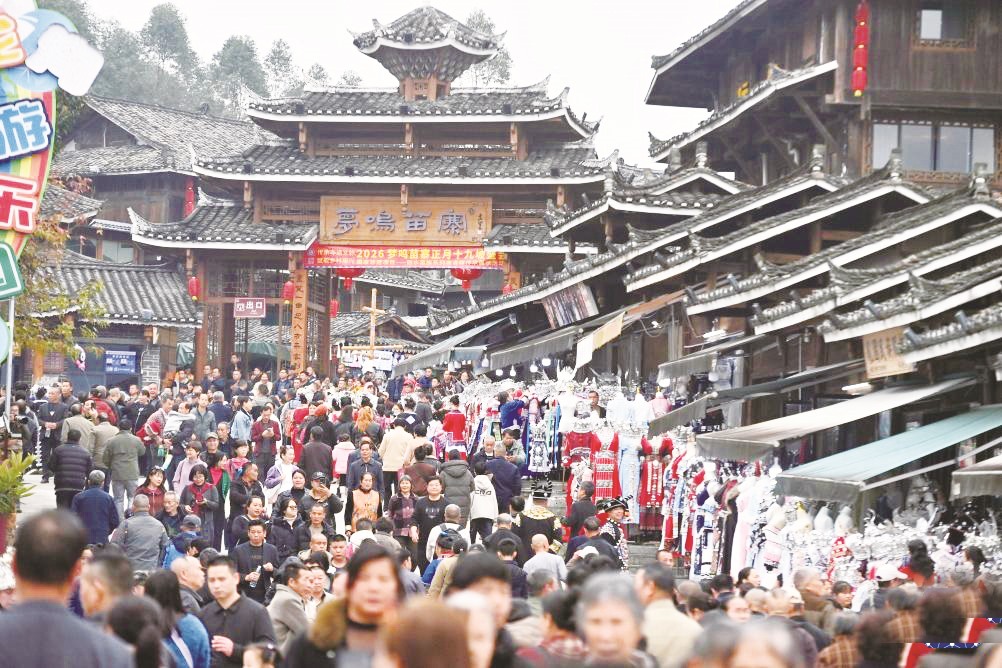 村民和游客在广西柳州市融水苗族自治县梦呜苗寨参加坡会。