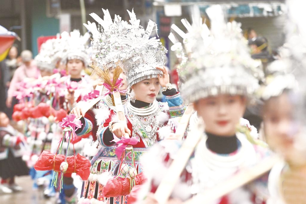 苗族妇女在广西柳州市融水苗族自治县杆洞乡百鸟衣芦笙坡会进行民俗展演。
