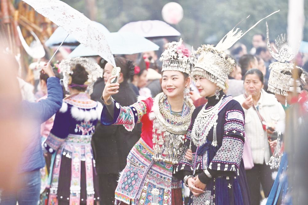苗族妇女参加广西柳州市融水苗族自治县香粉乡古龙坡坡会。