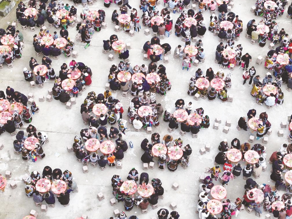 在广西柳州市融水苗族自治县杆洞乡党鸠村,村民和游客在坡会上共进百家宴(无人机照片)。