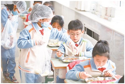 ▲首都师范大学附属小学某班级分餐员分发馒头。 (谢晗/摄)
