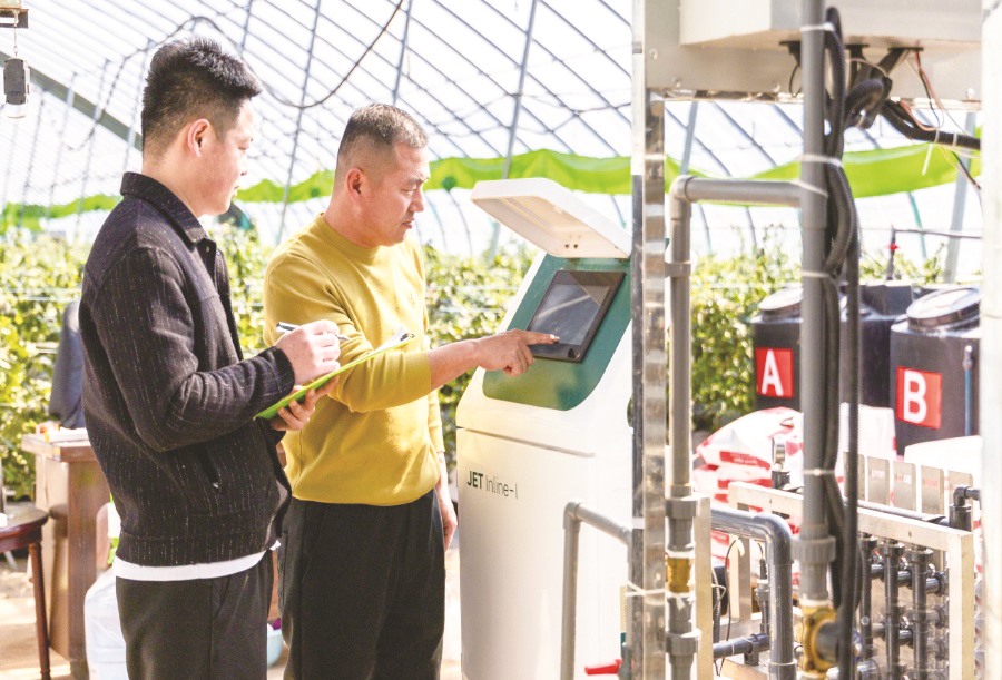 在呼和浩特市玉泉区后本滩村蓝莓种植基地智能温室大棚内,工作人员在调控智能水肥一体机。