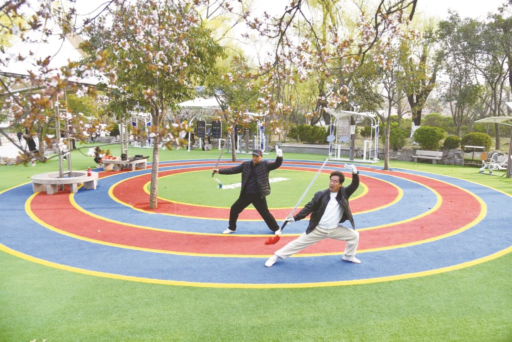 ▲济南泉城公园内,健身爱好者在全龄智能健身区练习太极剑(3月22日)。